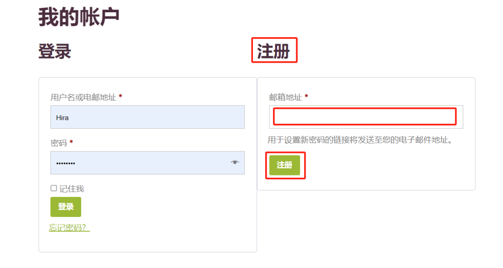 第二步:进入【我的账户】,在右边的【注册】栏下面,输入邮箱地址,点击【注册】,邮箱收到一个设置新密码的链接,进入链接设置密码计可,然后完成注册