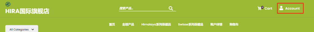 第一步:进入HIRA线上商城首页,点击页面顶部右上角【Aaccount】,在左边的【我的账户】栏下面,输入邮箱地址及密码,完成会员登录