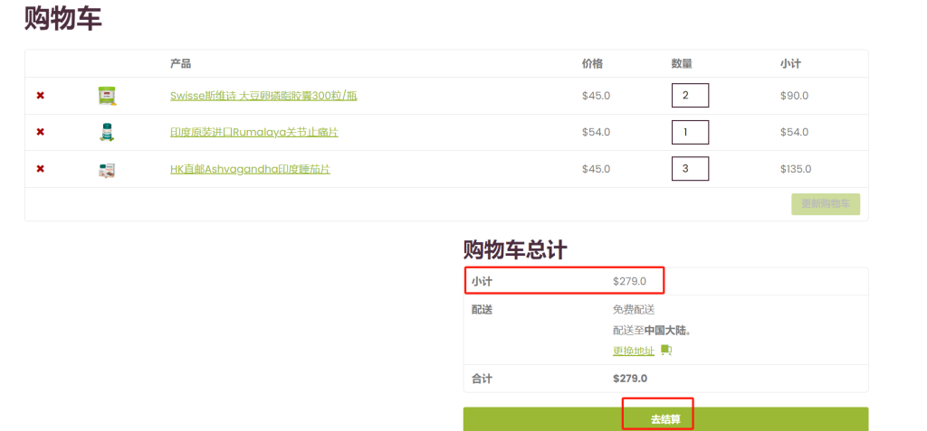 第二步:选择所需产品的数量,加入购物车。购买多种产品,可以在产品界面添加其它产品即可,然后查看网站右上角的购物车【Cart】,所购产品都有显示,购物车里的产品可以增减,可以删除,可以重新选择数量。订单修改后,需要【更新购物车】