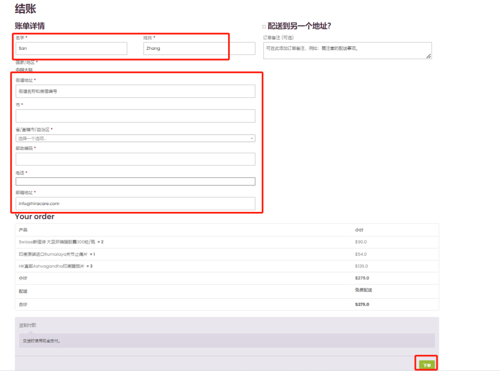 第四步:进入【结账】界面,填写名字,联系方式,及配送地址,然后点击【下单】